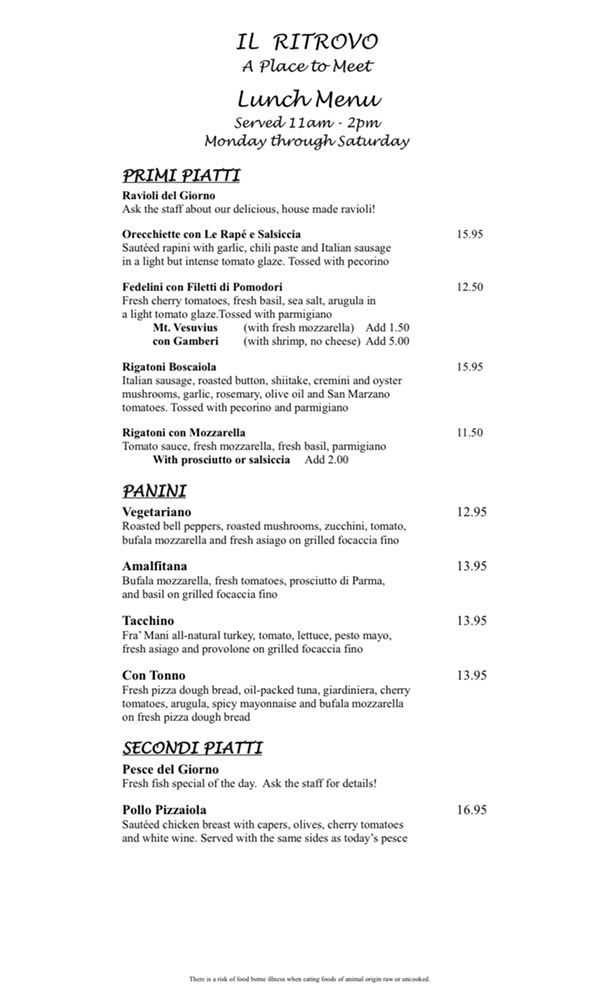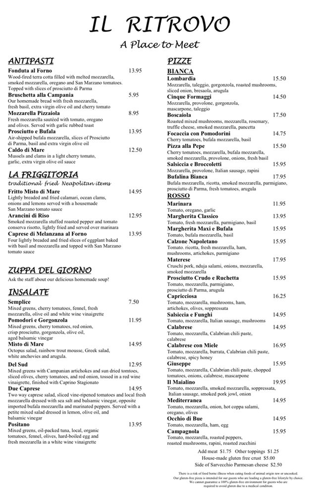 Welcome to Il Ritrovo, a cozy Italian pizza restaurant located in Sheboygan, WI. This hidden gem offers a variety of authentic pizzas, antipasti, insalate, and more. The menu features tantalizing dishes such as Fonduta Al Forno, a woodfired terra cotta filled with melted mozzarella and prosciutto di parma, and the Giardiniera salad, a housemade hot and sweet mixed vegetable salad with hot coppa salami and aged provolone.